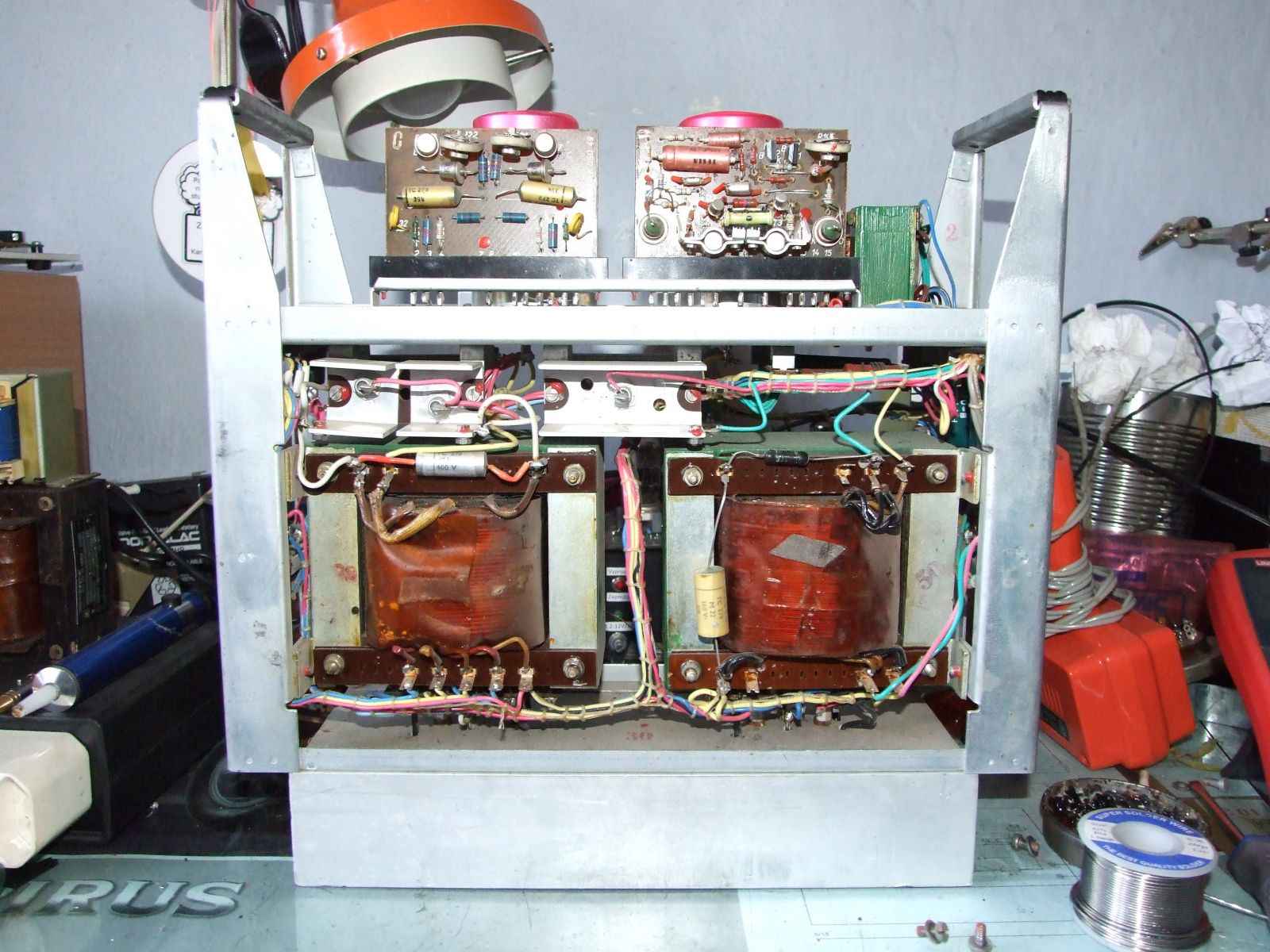 Nyní jsou mé moduly rozebrány a budou přestavěny na zesilovače od pana Andrlíka, který zde také později uvedu. Z původních zesilovačů zbyly jenom napájecí trafa a usměrňovací diody.