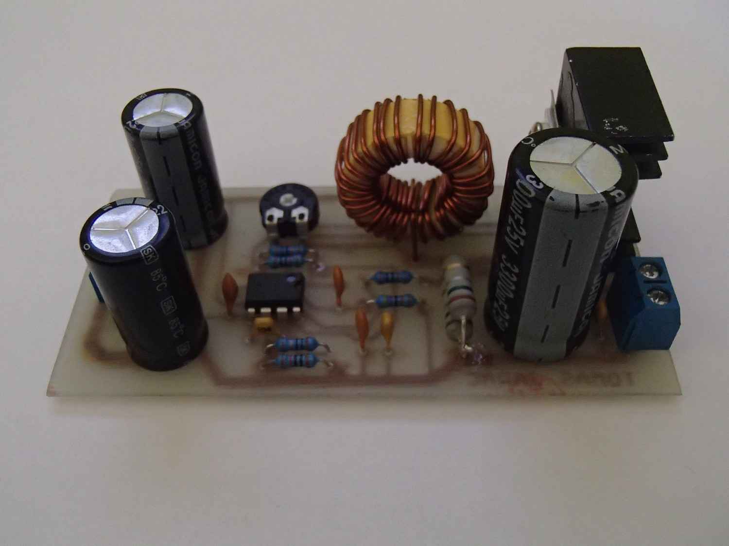 Měnič pro notebook využívá topologii spínaného zvyšovače napětí. Napětí na výstupu je vždy vyšší než napětí na vstupu. Funkci řídícího obvodu zastupuje integrovaný obvod UC3843. Tento obvod je PWM kontrolér s pevnou frekvencí v proudovém režimu. Obsahuje oscilátor, chybový zesilovač, PWM komparátor a budič hradla tranzistoru MOSFET/IGBT. Je vhodný pro jednočinné propustné i blokující zdroje i neoddělené měniče s tlumivkou. Bočník zařazený v elektrodě Source u tranzistoru T1 plní dvě funkce. Slouží ke snímání proudu a pro řízení PWM. Pracovní frekvence je 80kHz. Minimální napájecí napětí měniče je 8,5V a maximální napětí je rovno výstupnímu napětí. Tlumivka L1 je navinuta na toroidním železoprachovém jádře a má 30 závitů drátem o průměru 1mm. Jako spínací prvek je použit unipolární tranzistor typu MOSFET s vodivostí N (T1). Měl by mít v sepnutém stavu co nejmenší odpor, aby nevznikaly příliš velké ztráty. Dioda D1 je typu Schottky, jelikož pracovní napětí je dostatečně malé. Výkonová ztráta na diodě při plném zatížení je přibližně 2W a je přišroubovaná na společný chladič, na kterém je i spínací tranzistor. Dioda i tranzistor jsou izolačně odděleny od chladiče. Nevýhodou měniče je, že bez přidání dalších aktivních součástek není odolný vůči přetížení nebo zkratu.