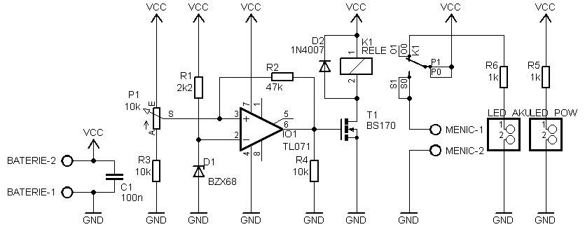 Ochrana odpojí měnič od akumulátoru dříve, než dojde k jeho hlubokému vybití. Akumulátoru je tak prodloužena životnost, popř. je chráněn před zničením. Obvod je realizován jako komparátor s hysterezí. Základem zapojení je operační zesilovač TL071, který porovnává dva zdroje napětí. Na invertujícím vstupu operačního zesilovače je zapojen první zdroj referenčního napětí se zenerovou diodou 6V8 (D1). Druhý zdroj napětí je připojen na neinvertující vstup operačního zesilovače. Je tvořen napěťovým děličem, který je připojen přímo na napájecí napětí, které je shodné s napětím na akumulátoru. Napěťový dělič je tvořen rezistorem R3 a trimrem P1, kterým se nastavuje práh, kdy dojde k odpojení měniče od akumulátoru. Kondenzátor C1 je umístěn co nejblíže operačního zesilovače a chrání jej před rozkmitáním. Výstup operačního zesilovače je posílen unipolárním tranzistorem typu MOSFET (T1), který dále spíná relé (K1). Dioda D2 chrání tranzistor před zničením napěťovými špičkami. Relé pak svými kontakty odpojí měnič od akumulátoru. Ochrana vypíná při poklesu napětí pod hodnotu napětí 10,8V a zapíná, když je hodnota napětí větší jak 12V. Tento rozdíl napětí vypnutí a sepnutí je důvodem použití hystereze. Indikaci zajišťují dvě LED diody. Zelená dioda indikuje přítomnost palubního napětí automobilu. Červená blikající dioda indikuje vybití akumulátoru a odpojení měniče.