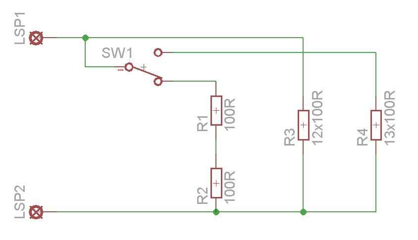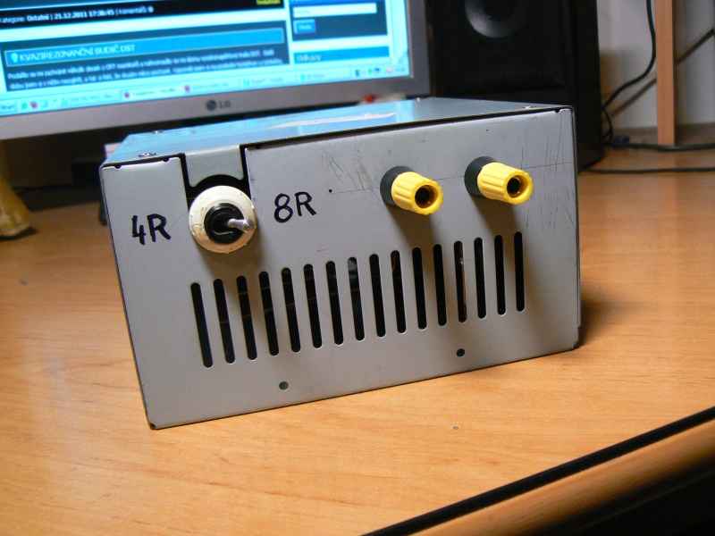 Při opravách, seřizování a stavbě nf audio zesilovačů je potřeba mít po ruce nějakou zátěž, na které by jsme vlastnosti zesilovače mohli změřit. Dlouhou dobu jsem používal dva paralerně spojené drátové odpory s pohyblivou odbočkou, kterou jsem si vždy nastavil potřebnou hodnotu. Tohle stačilo na zesilovače do max 15 - 20 W. Rozhodl jsem se tedy postavit lepší zátěž. K tomuto účelu jsem si delší dobu schovával 100R 15W rezistory. Kombinace pro získání 4R byla jednoduchá 100 / 4 a výjde nám 25 odporů. Jak ale získat 8R ? Opět výpočtem nám výjde 12,5 kde půlka představuje dva rezistory sériově. Přepínání mezi 4R/8R jsem vyřešil klasicky přepínačem. Lépe pochopíte ze schématu: