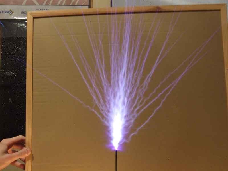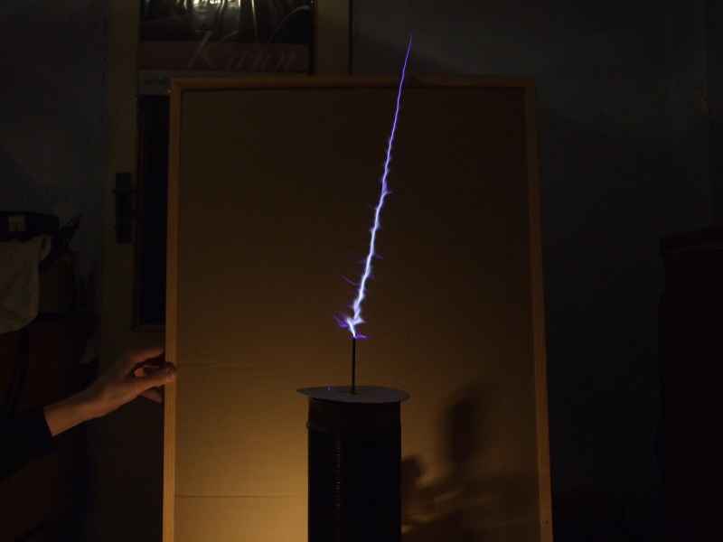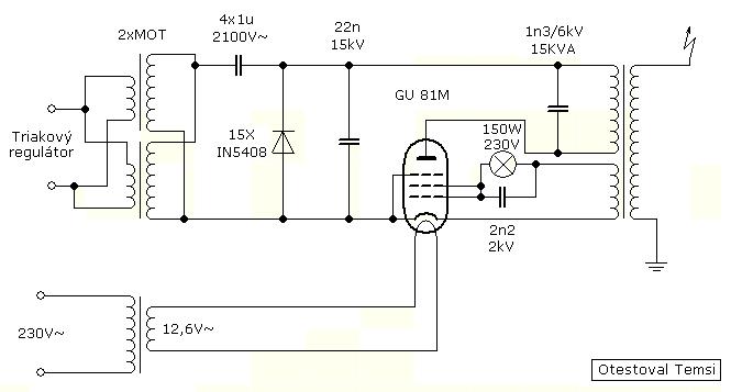 ZDE. K napájení jsou použité dva paralelně spojné MOTy se zdvojovačem. Dále následuje blokovací kondenzátor 22n/15kV poskládaný z MMC. Žhavení elektronky zajišťuje trafo 12V/26A (315VA), které dává naprázdno 13V a po zatížení elektronkou klesne na 12,5V. Elektronka pracuje v triodovém zapojení, tzn. že mřížky G1 a G2 jsou spojeny. Jako mřížkový odpor slouží žárovka 150W/230V. Sekundár je navinut drátem 0,5mm (+- 800z) na šířce 8cm o délce 40cm. Primár je vinut na PVC o průměru 18cm, na ní jsem navinul 40z s odbočkami. Pod primárem se nachází FB vinutí s 17z také s odbočkami. Rezonanční kondenzátor obsahuje dva pulzní kondenzátory 680p/6kV/15kVA paralelně. K regulaci výkonu je použitý jednoduchý triakový regulátor. Výboje přeskakují 30cm pravítko.